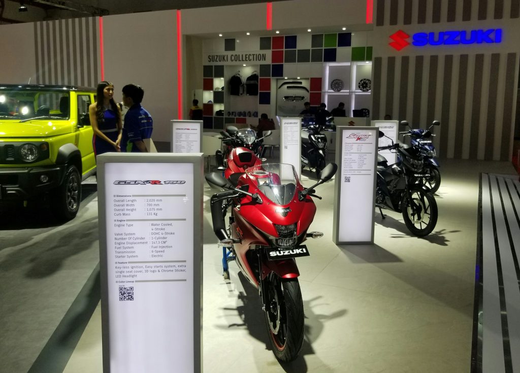 Bersanding dengan mobil-mobil Suzuki, SIS memajang sepeda motor Suzuki GSX-R150 Mat Red Edition, GSX-R150 ABS, All New Satria F150 danNEX II Elegant Premium yang saat ini merupakan tipe-tipe yang paling dicari oleh publik di Tanah Air.