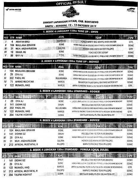 Sebanyak 148 starter turun ke lintasan untuk saling beradu di tujuh kelas berbeda, diantaranya Kelas Bebek 150cc Tune Up Expert, Kelas Bebek 150cc Tune Up Novice, Kelas Bebek 150cc Standart Rookie, Kelas Bebek Bebek 150cc Standart Novice, Kelas Bebek 150cc Standart Pemula Lokal SulSel, Kelas Matic 130cc Standart Open, dan Kelas Matic 130cc Standart Showroom.