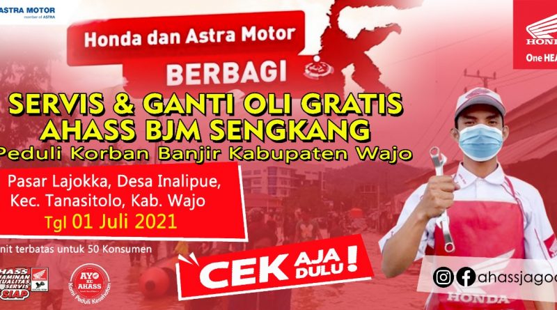 Astra Motor Sulawesi Selatan selaku main dealer sepeda motor Honda untuk wilayah Sulawesi Selatan, Barat, Tenggara, dan Ambon melalui Astra Honda Authorized Servis Station (AHASS) cepat tanggap beri bantuan Corporate Social Responsibility (CSR) bertajuk Honda & Astra Motor Berbagi. Bantuan berupa layanan servis gratis ini akan dilaksanakan pada Kamis, 1 Juli 2021 bertempat di Pasar Lajokka, Desa Inalipue, Kabupaten Wajo, Sulawesi Selatan. AHASS Asmo Sulsel berikan layanan berupa Servis dan Ganti Oli Gratis serta Gratis layanan pemeriksaan safety parts untuk konsumen HONDA yang terdampak bencana banjir bandang.