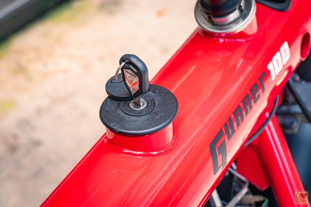 Sistem pengereman Phoenix Gunner 100 ini sudah menganut cakram muka belakang dengan 2 piston, speedometer sudah full digital, velg lebar tipe CW dengan diameter 12 inci, tapi sayang mesin masih menganut sistem pembakaran karburator.