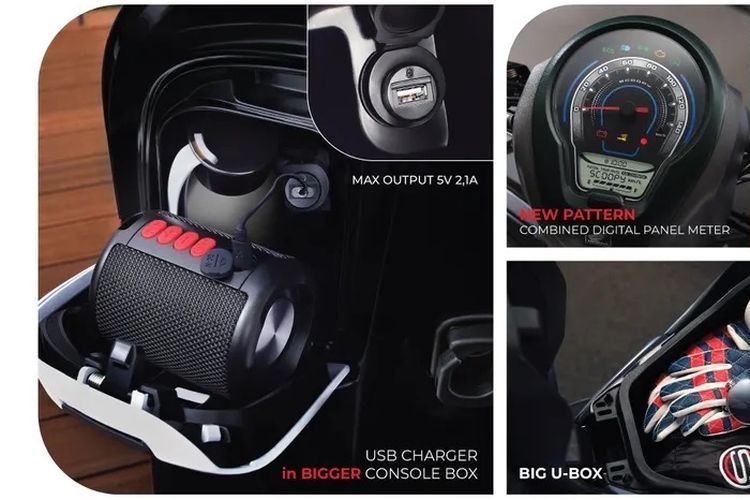 Di samping itu, Scoopy juga masih mengusung teknologi frame (rangka) eSAF (enhanced Smart Architecture Frame). Termasuk juga pengisi daya baterai ponsel jenis USB (USB charger), serta pilihan tipe dengan penyematan fitur Smart Key. Baca juga: Wujud Tesla Cybertruck Produksi Massal, Pakai Setir ala Model S Plaid Terakhir, terdapat kombinasi terbaru panel meter digital dengan layar LCD dengan pola desain terbaru mampu menyajikan informasi beragam. Ada penunjuk waktu digital, konsumsi bahan bakar rata-rata dan real time, tripmeter, indikator Smart Key dan indikator baterai (khusus untuk tipe Smart Key), serta mempertahankan indikator ECO sebagai panduan berkendara efisien.