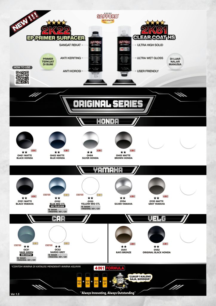 Roda2makassar.com – Halo bosku, yang sedang mencari referensi warna untuk merestorasi, memperbaharui atau merubah warna motornya dengan menggunakan cat kaleng atau arosol atau spray paint, ini ada panduan warna atau katalog dari merek Sapporo Ultimate yang hadir dengan berbagai macam pilihan warna mulai dari warna solid, metalik, candy, xirallic dan lain-lain.