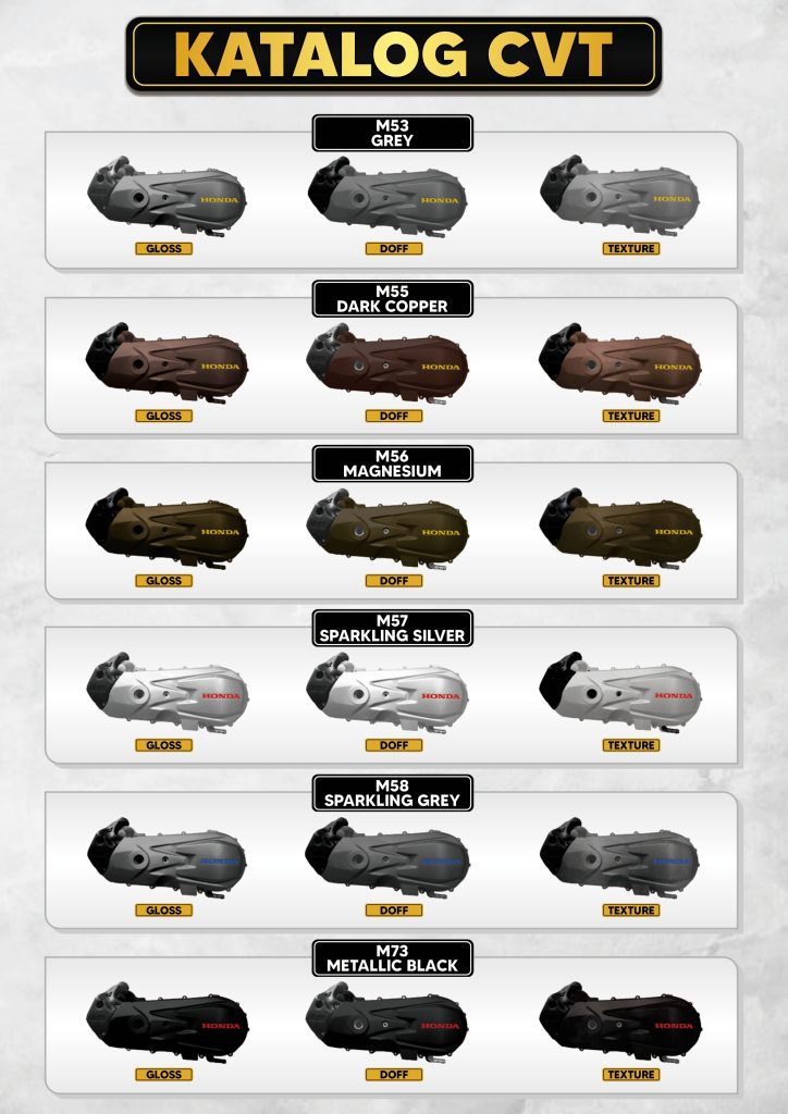 warna metalik, xirallic, candytone, dashboard series untuk body kasar, hitemp, dan clear coat untuk finishing.