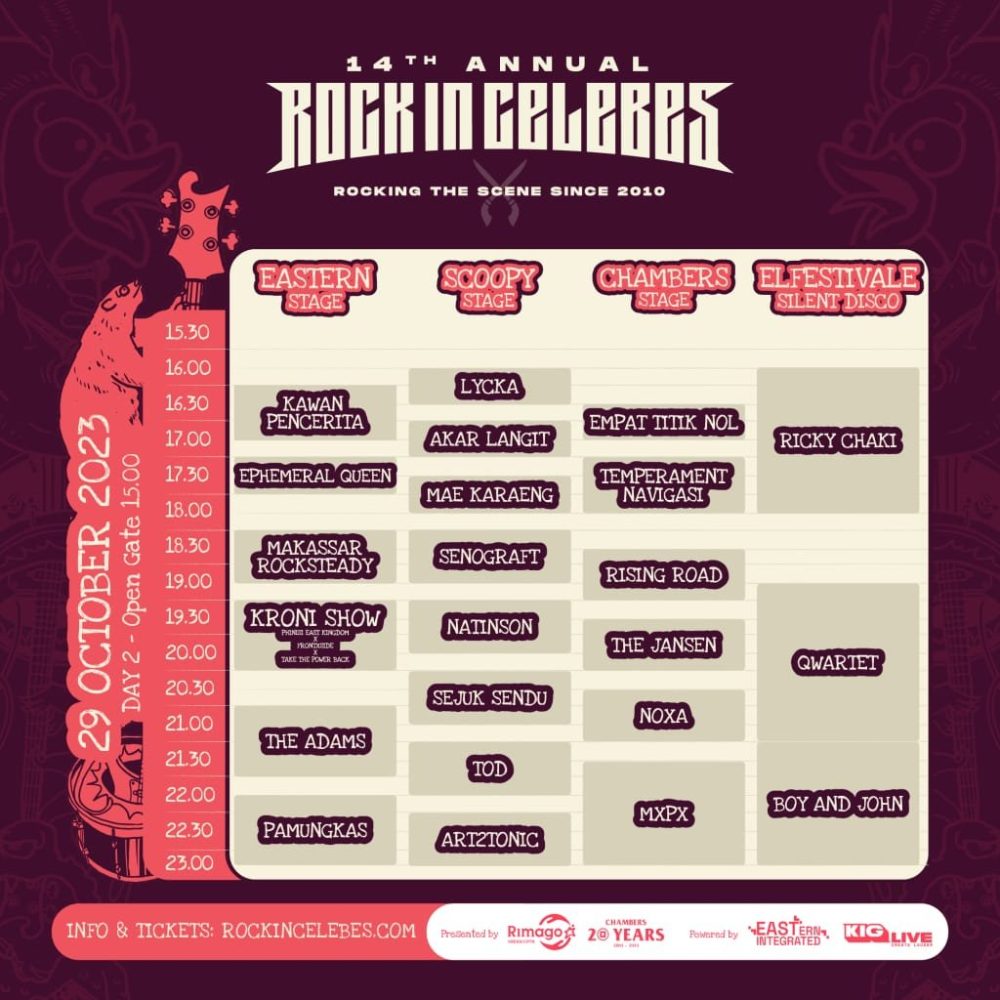 Sementara itu, Marketing Communication Asmo Sulsel, Moh Arif Reda, mengatakan bahwa Asmo Sulsel menggelar beragam aktivasi dalam 14th Annual Rock in Celebes. Salah satunya adalah Scoopy Stage yang akan dimeriahkan oleh banyak musisi, seperti Kapal Udara dan Orkes Tuming Abu.